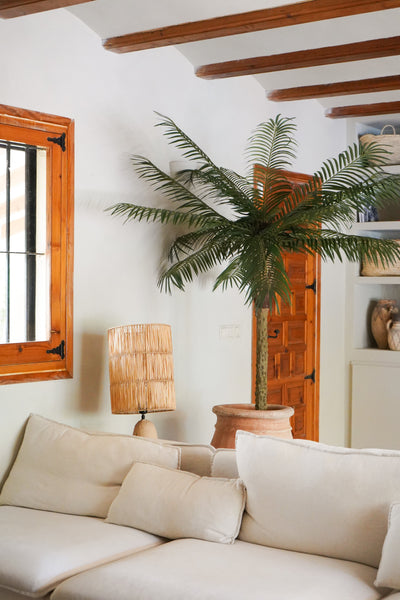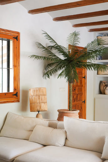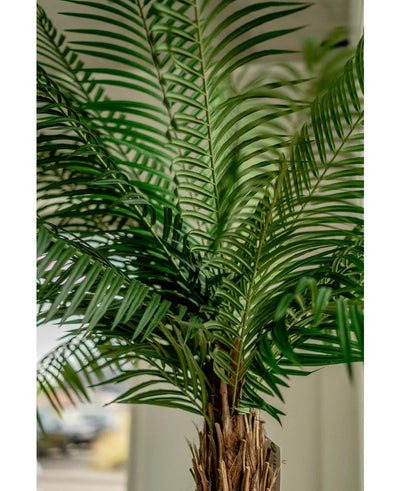 Get the tropical feeling in and choose this cool art palm Phoenix de Luxe. An impressive appearance of no less than 2.00 m high with a tribe of real wood. The characteristic leaves of the art palm are of high -quality plastic and color -fast. Close your eyes and with a little imagination you can feel the white sand between your toes and the warmth of the sun on your face. A very beautiful art palm tree to provide an indoor swimming pool, office space, shopping center or sauna complex with a tropical edge. What do you think of it, you will soon also enjoy the atmosphere that brings this beautiful art Phoenix Palm ?