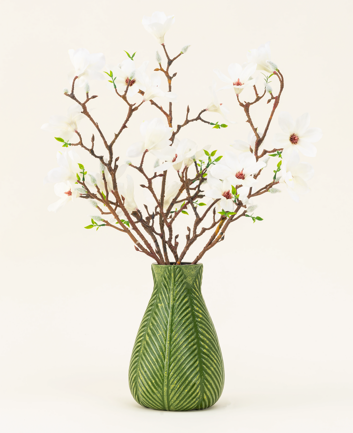 Bring a sense of peace and elegance into the house with the silk artificial flowers bouquet Magnolia white , consisting of three graceful stems. The large white magnolia flowers, with their soft petals and lifelike details, ensure a serene and luxurious look that fits into any interior.
