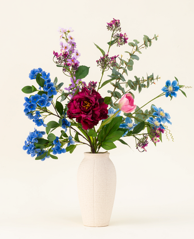 The bouquet is carefully composed and contains a rich mix of silk flowers, including Snowball Real Touch, Clematis Double, Wild Hydrangea, French Tulip, Pion, Delphinium and Eucalyptus . This combination provides a playful but harmonious whole, in which shape, texture and color come together into a refined bouquet.